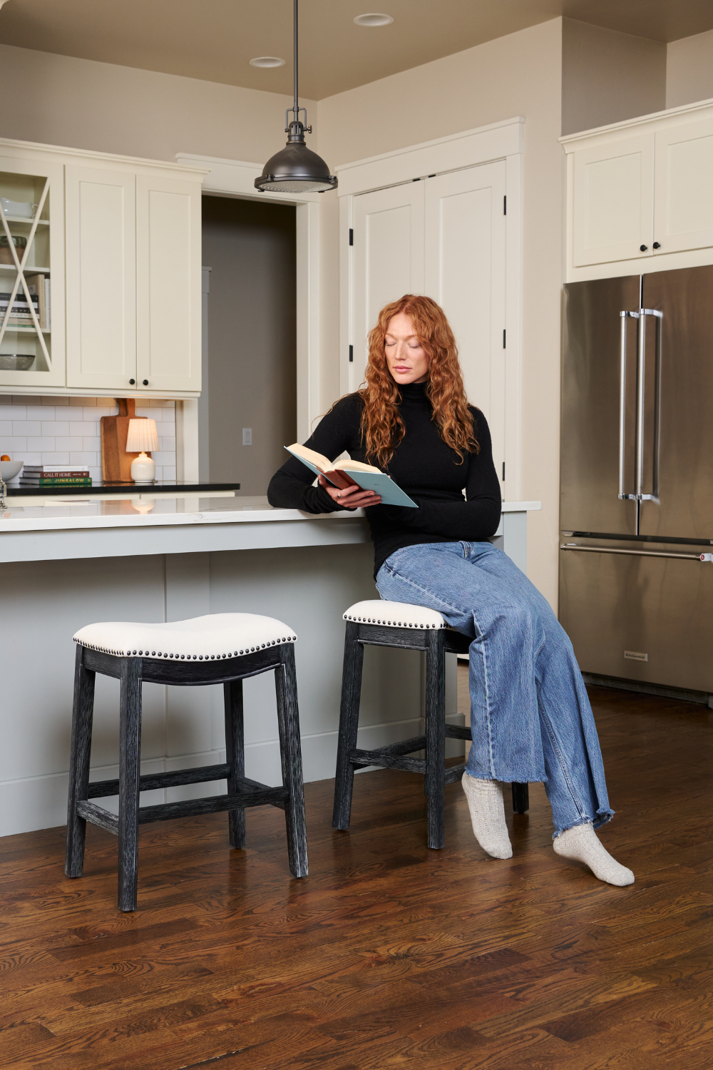 Adrien Saddle Bar Stool in Black Finish with White Fabric