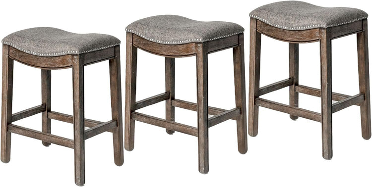 26" Adrien Saddle Counter Stool in Brown Finish with Grey Fabric (Set of 3)