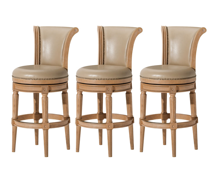 Sold as a set of 3, the Maven Lane Pullman Bar Stool offers a perfect balance of classic charm and everyday function, beautifully finished with a finely upholstered seat, classic nailhead trim, and a smooth 180° swivel making it a standout addition to bars, pub tables, and tall kitchen counters.