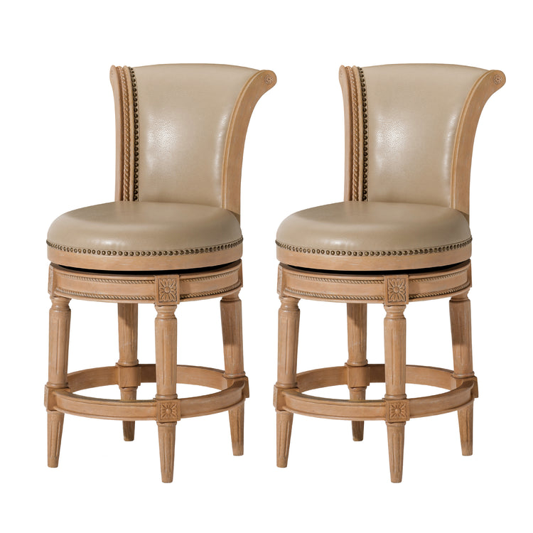 Sold as a set of 2, the Maven Lane Pullman Counter Stool offers a perfect blend of comfort, style, and functionality, beautifully finished with a finely upholstered seat, classic nailhead trim, and a smooth 180° swivel making it an ideal seating choice for everyday dining or casual gatherings.
